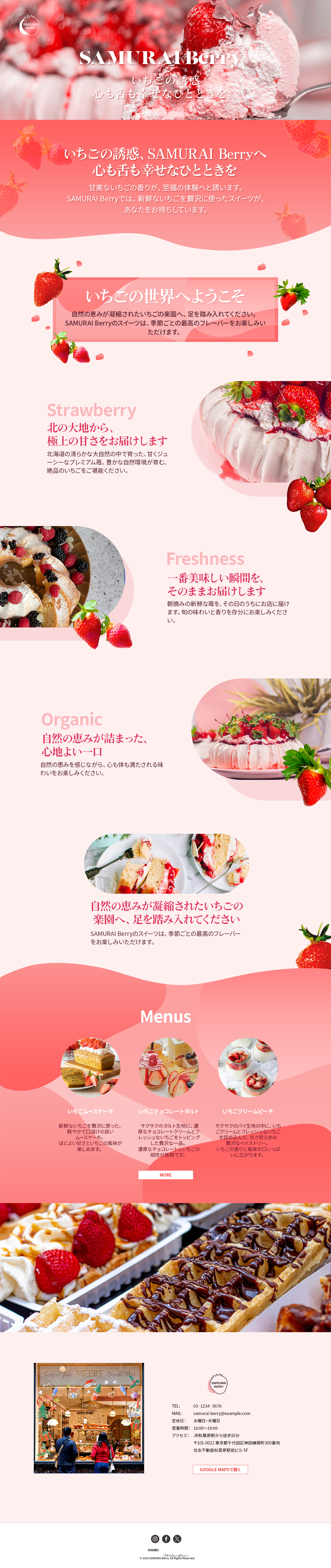 スイーツ店のLP URL ここにURLを入れてください。 担当 デザイン サイトの目的 お客様の自社メディアサイトでの使用。また広告での使用。 使用技術 Adobe Photoshop デザインについて メインターゲットが女性であることを考慮した配色をさせていただきました。 Works一覧へ